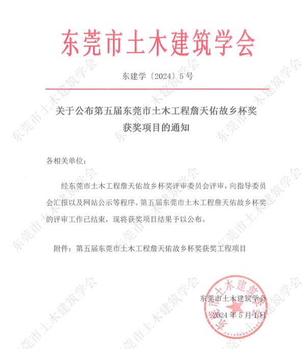 168体育app官网下载地址承建项目荣获东莞市土木工程詹天佑故乡杯奖