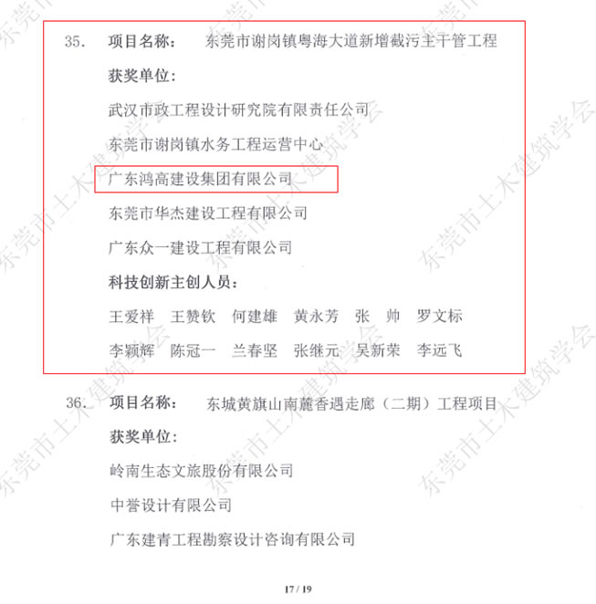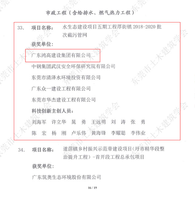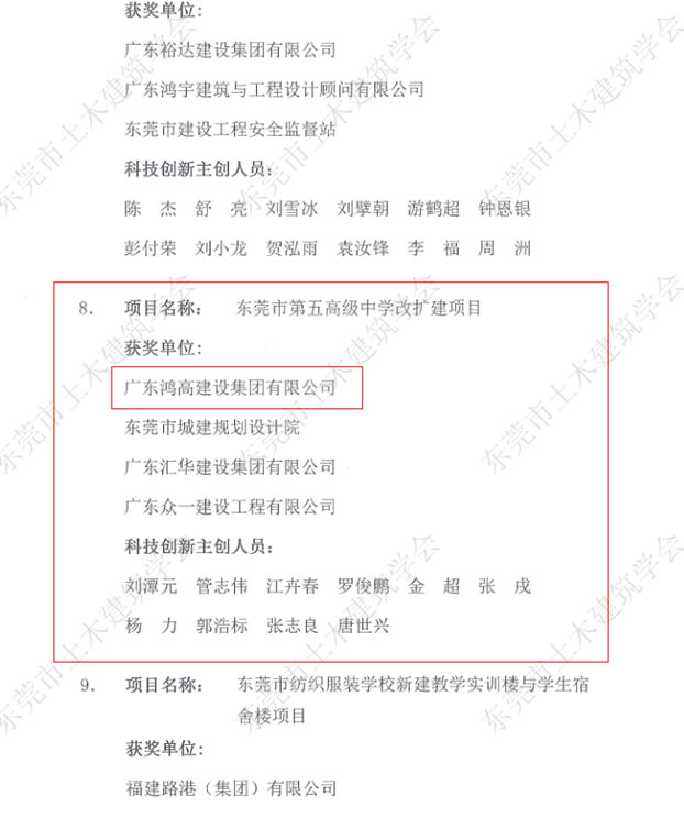 近日,由168体育app官网下载地址承建的东莞市第五高级中学改扩建项目、水生态建设项目五期工程厚街镇2018-2020批次截污管网、谢岗镇粤海大道新增截污主干管工程项目荣获东莞市土木建筑学会颁发的第五届东莞市土木工程詹天佑故乡杯奖。