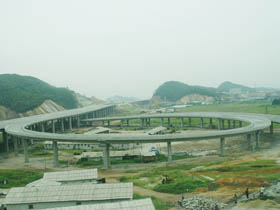 在惠常一标的施工现场,车子终于打住了它狂奔的脚步,停在了一座高架桥面前,仰头仔细打量,在秋日太阳的直射下,施工中的路桥就象一道彩虹,划破了湛蓝的天幕,巍峨地耸立在前方。