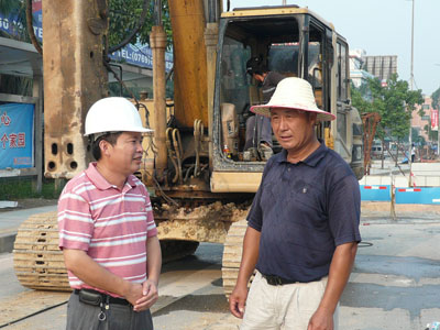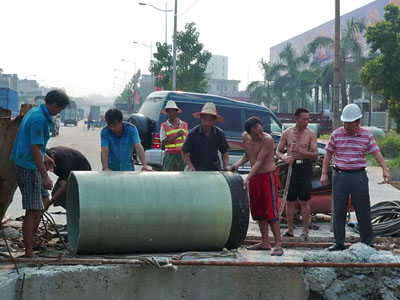 跟着林经理去施工现场,在路上,林经理指着大朗街道上一条新铺好的水泥路面,对我们说:“那边就是我们刚埋好的污水管网。”骄傲之情溢于言表。而工地上,工人们正把一节直径有半人高的排污管推入挖好的地下排污通道中,看到我们的到来,大家纷纷熟稔地跟林经理打招呼:“林工,又过来了?”看的出,工人们跟林经理的关系都很好。林经理告诉我们,他平时基本上都是在施工现场。“只有深入到工地的生产当中去,了解生产当中的困难,才能及时、更好地解决。”林经理如是说。